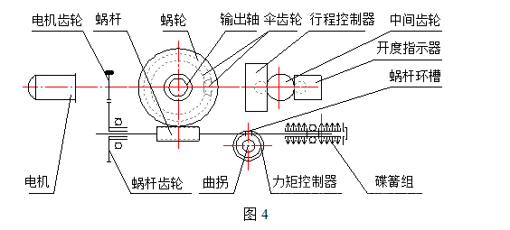 DZW型电动执行机构由电动机、减速器、力矩控制器、行程控制器、开度指示器、手—电动切换机构、手轮及电气部分组成。普通型为平面密封;户外型采用了圆止口和O型圈密封;隔爆型与户外型的密封结构相同,并增加了隔爆面结构,采用了隔爆型接线盒和YBDF系列户外、防腐、隔爆型电动阀门用三相电动机。其传动原理如图4所示。