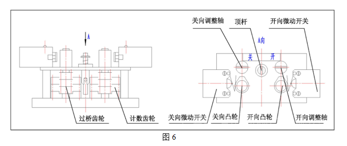 采用十进制计数器原理,控制精度高。为全系列通用部件,其结构见图6。其工作原理为:由减速箱内的一对大小伞齿轮带动主动小齿轮(Z=8),再带动行程控制器工作。如果行程控制器按阀门开、关的位置已调整好,当控制器随输出轴转动到预先调整好的位置(圈数)时,则凸轮将转动90°,迫使微动开关动作,切断电机电源,使电机停转,从而实现对电动执行机构行程(转圈数)的控制。