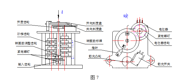 为全系列通用部件,其结构见图7。输入齿轮由计数器个位齿轮带动,经减速后,指示盘随阀门的开关过程同时转动,以指示阀门的开启或关闭。电位器的轴和指示盘同步转动,供远传开度指示用,移动转圈数调整齿轮可以改变转圈数。开度指示器内设一微动开关和凸轮,当电动执行机构运转时,旋转凸轮周期性地使微动开关动作,其频率为输出轴转动一圈动作一次或二次,可供闪光信号等使用。