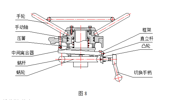 为半自动切换,其结构见图8。它由手柄、凸轮、框架、直立杆、中间离合器、压簧等组成。用手轮操作时,先把切换手柄向手动方向推动,凸轮随手柄轴一起转动,使支撑在凸轮面上的框架抬起,同时使支撑在框架上可在输出轴上作轴向移动的中间离合器也抬高,并压迫压簧。当手柄推到一定位置时,中间离合器即脱离蜗轮而与手轮啮合,则可使手轮上的作用力通过中间离合器传到输出轴上即成为手动状态。当框架抬高到一定高度时,安装在框架上的直立杆在扭簧作用下直立于蜗轮端面,支撑住框架使中间离合器不致下落,手柄推到手动位置时即可放开,用手轮操作。当电机带动蜗轮转动时,直立杆即倒下,在压簧作用下中间离合器迅速向蜗轮方向移动,并与蜗轮啮合,同时与手轮脱开,则成为电动状态。(如手动切换、切不到手动位置时,请边切换手柄,边转动手轮)