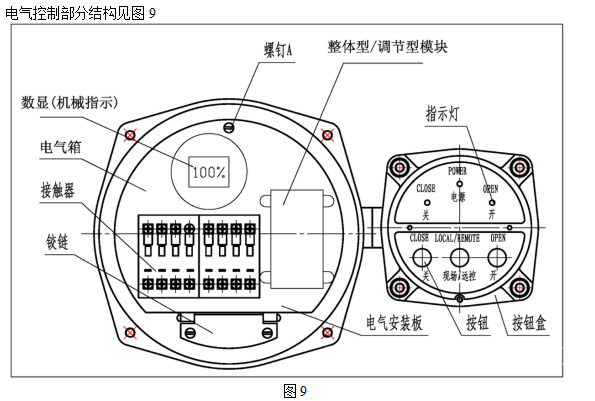 打开电气箱盖,松开电器安装板上的螺钉A(见图9),把电器安装板翻转90°,即可对力矩控制器,行程控制器,开度指示器进行调整。调整方法见6.1、6.2、6.3。整体型开度表支架上装有开度表调整电位器,用于调整开度表。