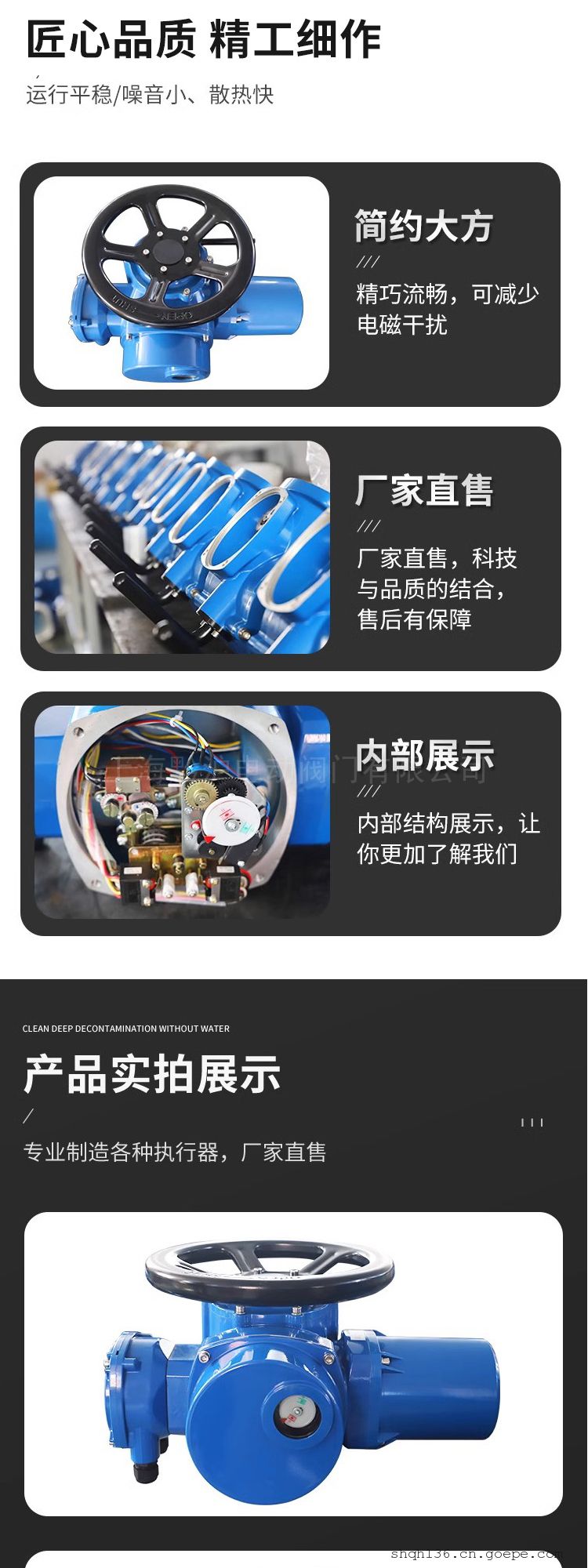 5.3.1户外型系列:当输出轴上受到一定转矩后,蜗杆除旋转外还产生轴向位移,带动曲拐、曲拐动作时带动轴和凸轮压迫微动开关、切断电机电源、使电机停转,从而实现对电动执行机构输出转矩的控制、达到保护电动阀门的目的。